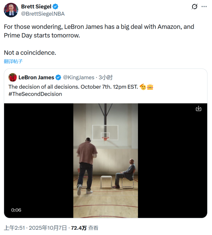 ClutchPoints记者Brett Siegel转发詹姆斯社媒并写道:“对于那些好奇的人,詹姆斯与亚马逊签了一份大合同,而Prime会员日明天就开始了,这绝非偶然。如果这并非亚马逊的宣传,那或许是詹姆斯在宣布2025-26赛季将是他效力湖人的最后一年,我很难相信他会以这种方式宣布退役。”